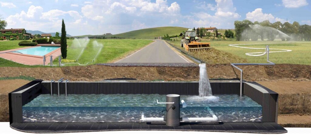 Cisterne interrate Ecotanking modulabili con membrana in EPDM. Vasche volano, vasche di prima pioggia, vasche di laminazione, sistemi fognari, stoccaggi idrici interrati, vasche di prima pioggia con disoleatore, riserve idriche interrate, cisterne carrabili pesanti, raccolta acqua piovana