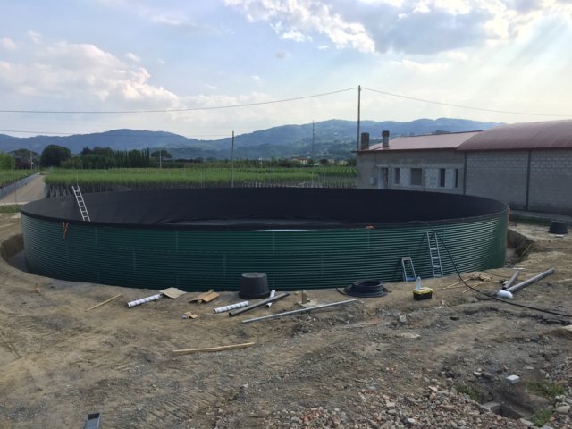 Vasche prefabbricate in acciaio con membrana impermeabile in EPDM. Cisterne in lamiera, serbatoi per acqua, silo in acciaio per riserve d’acqua, vasche per florovivaisti, vasche in acciaio per stoccaggio reflui zootecnici, digestato, acque vegetative, cisterne coperte con sistemi galleggianti o in tensione